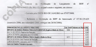 Antes, porém, deseja, já que o blogueiro é um cidadão comum como o ex-presidente, reivindicar igual presteza nas providências da Receita sobre a notificação em que foi acusado de sonegar R$ 0,06 (seis centavos) que, acrescidos de multa e mora, representaram uma autuação de R$ 0,11 (onze centavos).
