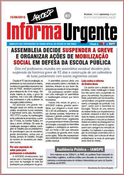 Como enfatizou Maria Izabel Noronha, presidenta da Apeoesp, a paralisação não obteve qualquer vitória econômica, mas serviu para demonstrar a força da categoria e para desmascarar os verdadeiros inimigos da educação. “Ninguém vai sair de cabeça baixa”, afirmou na assembleia de sexta-feira. Ela lembrou que a greve teve a adesão de 75% das escolas e só entrou em refluxo após o corte do ponto dos servidores. Os professores retornam ao trabalho e compensarão os dias sem aula. Mas a categoria hoje está mais consciente do papel nefasto dos tucanos e da sua mídia chapa-branca.