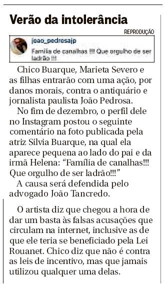 O colunista Ancelmo Gois, do jornal O Globo, informou neste sábado (16) que “Chico Buarque, Marieta Severo e as filhas entrarão com uma ação, por danos morais, contra o antiquário e jornalista paulista João Pedrosa. No fim de dezembro, o perfil dele no Instagram postou o seguinte comentário na foto publicada pela atriz Silvia Buarque, na qual ela aparece pequena ao lado do pai e da irmã Helena: ‘Família de canalhas!!! Que orgulho de ser ladrão!!!’... O artista diz que chegou a hora de dar um basta às falsas acusações que circulam na internet, inclusive as de que ele teria se beneficiado pela Lei Rouanet. Chico diz que não é contra as leis de incentivo, mas que jamais utilizou qualquer uma delas”.