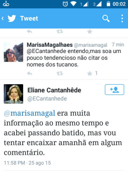 Ainda quando trabalhava na Folha, a jornalista Eliane Cantanhêde ficou famosa pelo seu entusiasmo com a "massa cheirosa" tucana durante uma convenção do PSDB. Hoje ela presta os seus serviços ao falido Estadão e também à Globo News e poderá acrescentar outro adjetivo no seu currículo: cheirosa e desatenta. Ao comentar a acareação do doleiro Alberto Youssef, que confirmou que o cambaleante Aécio Neves recebeu propina de Furnas, ela simplesmente esqueceu de citar o seu amigo tucano. De imediato, uma internauta questionou a sua parcialidade. A resposta foi típica do tucanês: "Era muita informação ao mesmo tempo e acabei passando batido". Hilária, para não dizer patética.