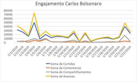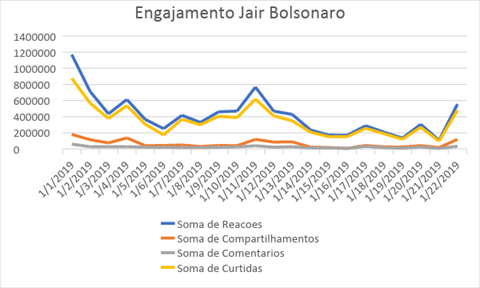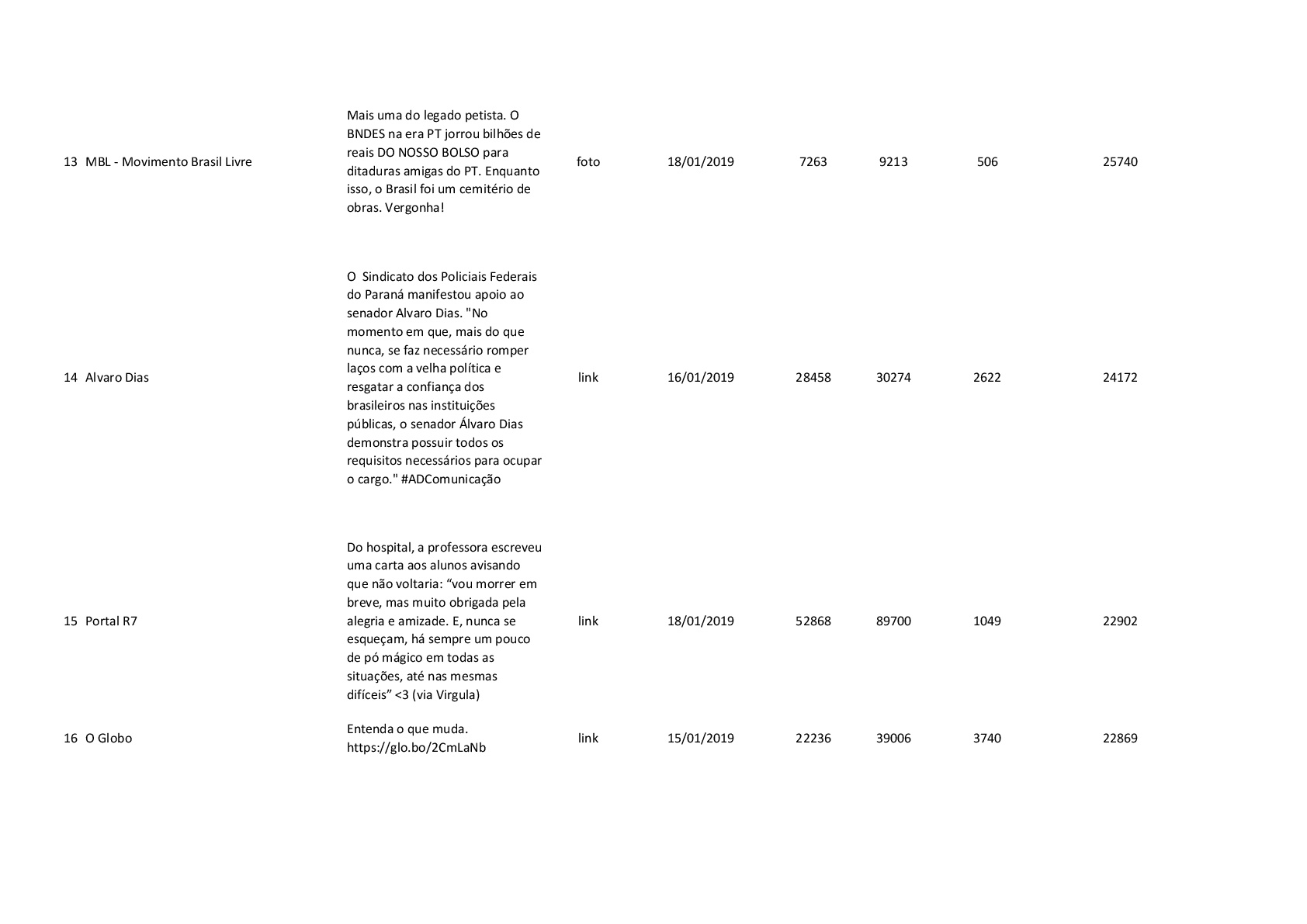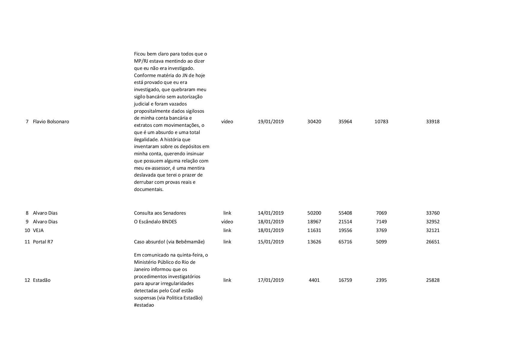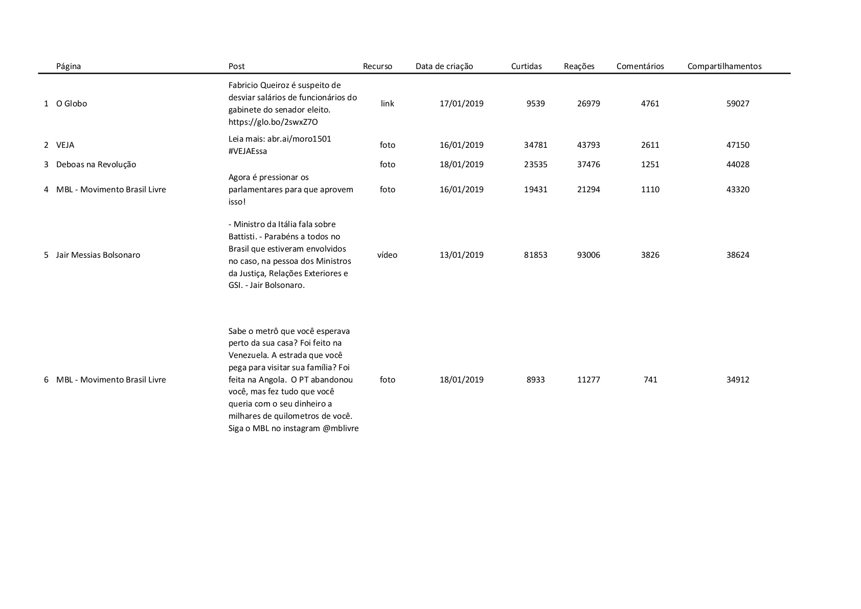 Seus posts mais compartilhados no período trataram da posse de Bolsonaro e do Fórum Econômico de Davos, ressaltando “o início de um novo tempo para o Brasil”, “que não enxerga o criminoso como vítima da sociedade, que não se associa a ditaduras e que sabe que um Estado gigante dá grandes margens a corrupção e ineficiência”.