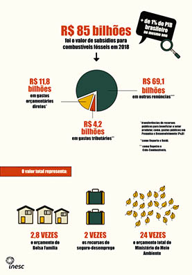 Para responder a essa pergunta, o Instituto de Estudos Socioeconômicos (Inesc) monitora, desde 2018, o volume dos recursos públicos alocados pelo governo federal nos combustíveis fósseis, da produção ao consumo. Estudo inédito do instituto mostrou que, em 2018, foram R$ 85,1 bilhões em subsídios – montante que corresponde a cerca de 1% do PIB e a 6% da arrecadação para o mesmo ano.