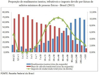 A divulgação dos dados de imposto de renda ocorrida recentemente tornou factível a mensuração das disparidades geradas pelo tratamento diferenciado dos rendimentos. Na medida em que os dividendos são isentos de impostos, os segmentos de renda mais elevados da sociedade contribuem proporcionalmente menos ao erário. O gráfico explicita que a base de rendimentos tributáveis de 2013 passa a cair para os indivíduos que receberam mais do que três salários mínimos. Inversamente, os rendimentos isentos passam a se elevar a partir dessa faixa. O pico de isenção de rendimentos em relação à renda é para quem recebeu entre 240 e 320 salários mínimos (R$ 162.720,00 e R$ 216.960,00). Ficaram imunes de impostos 68,81% das receitas desses indivíduos.