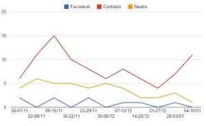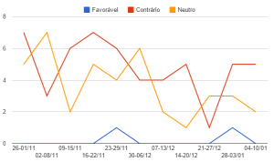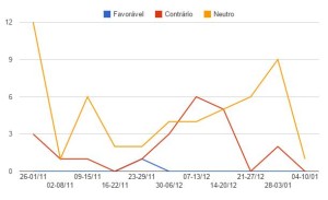 Vejamos agora os artigos de opinião, aqueles escritos pelos articulistas contratados dos jornais. Eles seguem perfil similar ao dos editoriais, com viés extremamente negativo, inclusive coincidindo com desenho da curva similar. O pico de artigos de opinião negativos se dá também na segunda semana de novembro, 15 textos negativos, quase um por dia por jornal. E na última semana, segunda de janeiro, o número também sobe, aqui para 13. Os neutros ficam sempre bem abaixo, sem qualquer exceção e os textos favoráveis variam entre 0 e 2 e 0 e 1, semana após semana.