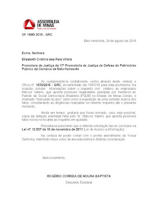 (…) “informações sobre o inquérito civil relativo ao empresário Marcos Valério, que aponta possíveis ilegalidades operadas por membros do Partido da Social Democracia Brasileira (PSDB) no Estado de Minas Gerais, o chamado “mensalão tucano”, bem como a expedição de uma certidão acerca dos fatos, considerando as diligências realizadas no referido inquérito até o presente momento.