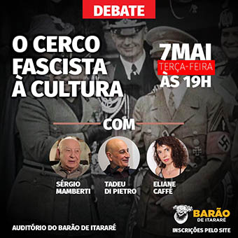 O cerco fascista imposto pelo governo Bolsonaro ao campo da cultura será tema de debate no dia 7 de maio, em São Paulo. A atividade acontece no Centro de Estudos da Mídia Alternativa Barão de Itararé (Rua Rego Freitas, 454, 8º andar, próximo ao metrô República), a partir das 19 horas, com transmissão ao vivo pela página da entidade.