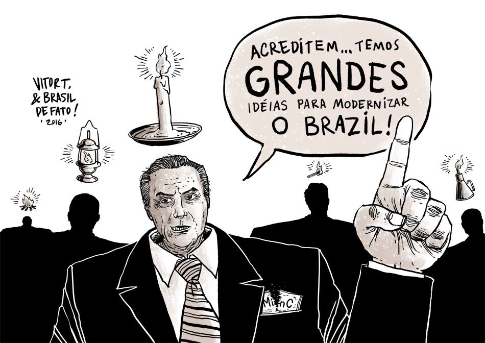 Com jeito e pretensões de quem veio para ficar, Michel Temer já disse o que pretende: seu projeto, seu ânimo, sua vontade, seu prazer é servir sem constrangimento ao retrocesso político-social. A apenas isso se reduz seu programa, seu projeto, seu discurso. Será, enquanto durar (praza aos céus que seja breve), um governo binário, do não aos interesses nacionais e populares, do sim aos interesses do capital rentista e da burguesia subsidiada da Avenida Paulista. Governará para a dívida e não para a produção; levará a ferro e fogo o ajuste fiscal anti-povo que sua base de hoje negou à presidente Dilma Rousseff, e criará novos impostos; para financiar os lucros do capital, já anunciou, reduzirá os gastos com saúde, educação e inclusão social, a saber, aquelas despesas que mais de perto dizem respeito às camadas mais pobres da população. Governará contra os pobres e uma de suas primeiras medidas será a alteração da lei da previdência, aumentando a idade mínima para a aposentadoria, o que só prejudica os pobres, pois só pobres dependem da previdência e só os pobres ingressam cedo no mercado de trabalho.