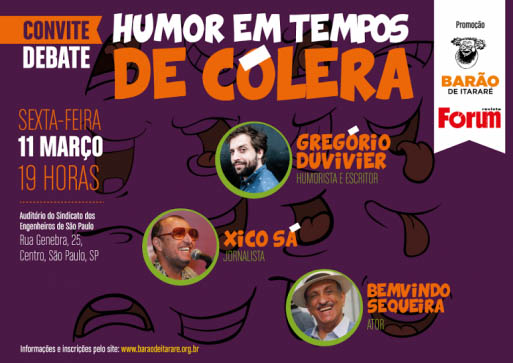 Anote na agenda: dia 11 de março, às 19h, o Centro de Estudos da Mídia Alternativa Barão de Itararé e a revista Fórum reunem um timaço em São Paulo para debater Humor em tempos de cólera. O humorista e escritor Gregório Duvivier, o jornalista Xico Sá e o ator Bemvindo Sequeira discutem a resistência à crescente onda conservadora e ao fascismo presente não só no humor, mas no debate político e na sociedade brasileira em geral.