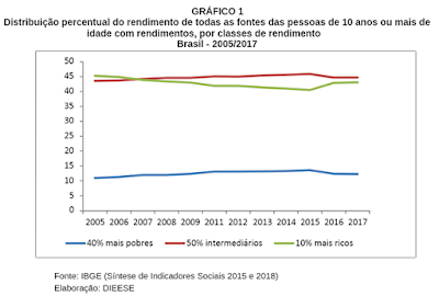 Como sintetizado no gráfico a seguir, retirado da publicação, até 2015, aumentou a participação dos 40% mais pobres e dos 50% intermediários na distribuição de rendimentos de todas as fontes e diminuiu a participação dos 10% mais ricos. No entanto, “essa trajetória de desconcentração de rendimentos se inverteu a partir de 2015, com perda de participação dos mais pobres e dos intermediários e elevação da parte dos 10% mais ricos”.