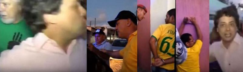 A partir do minuto 29 da coleção de vídeos, o que se assiste é um conluio criminoso: três jovens da UJS detidos, já imobilizados, de joelhos no chão e rosto para a parede, são agredidos, xingados e ameaçados por líderes do ato pró-impeachment com a conivência de policiais.