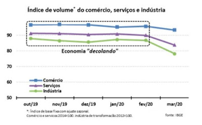 Dados antecedentes menos otimistas continuaram a surgir com o passar das semanas e, em março, os indicadores do IBGE para janeiro foram divulgados mostrando números desanimadores. Isso não impediu que o ministro, em abril, ainda afirmasse que o Brasil estava decolando antes da crise do coronavírus. Vinda de um expoente do governo que, não obstante as dezenas de milhares de mortos, continua não reconhecendo a gravidade da crise de saúde pública provocada pela pandemia, essa completa negação da realidade não surpreende.