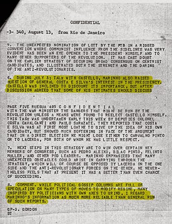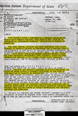 No dia 14 de agosto do 1965, ano seguinte ao golpe, o então embaixador dos Estados Unidos no Brasil, Lincoln Gordon, enviou a seus superiores um telegrama então classificado como altamente confidencial – agora já aberto a consulta pública. A correspondência narra encontro mantido na embaixada entre Gordon e Roberto Marinho, o então dono das Organizações Globo. A conversa era sobre a sucessão golpista.