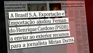 Eduardo Guimarães, no Blog da Cidadania : As bancadas do PT e do PCdoB na Câmara pediram que a Polícia Federal abrisse inquérito para investigar a suspeita de que o ex-presidente Fernando Henrique Cardoso usou a empresa privada Brasif para enviar dinheiro ao exterior para a jornalista Mirian Dutra, com quem ele manteve relacionamento extraconjugal ...Lula desmascara a família Marinho