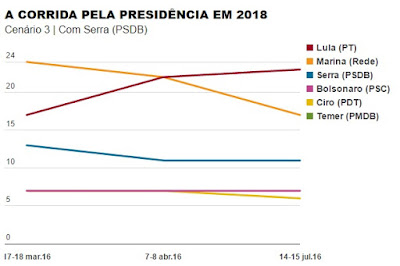 Por Eduardo Guimarães, no Blog da Cidadania : O Datafolha fez uma pesquisa eleitoral em dezembro do ano passado em que Aécio Neves chegaria à frente de Lula no primeiro turno, com 26% dos votos - ou 27%, num terceiro arranjo. O petista teria 20%, e Marina Silva (Rede), 19%. Se o tucano fosse Geraldo ...Cunha e os encontros "secretos" de Temer