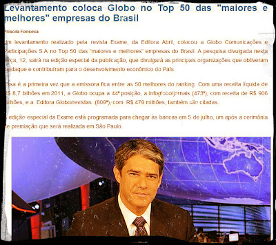 A segunda notícia, segundo levantamento de ninguém mais, ninguém menos que a Editora Abril, coloca a mesma Globo dentre as "maiores e melhores" empresas do Brasil. Dentre as maiores pode ser, visto que o oligopólio global recebeu muitas vantagens, políticas e financeiras, desde antes do lançamento da emissora de TV. Melhores? Não sei em qual sentido, principalmente quando se contrapõe as duas notícias. Para ajudar a reforçar a boa imagem da Globo, o Portal Comunique-se ainda escolheu a foto de um jornalista (na verdade, formado em Publicidade e Propaganda), âncora do JN. Acaso?
