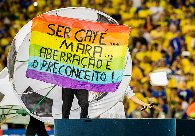 | Ativista abriu faixa na final da Copa com a seguitne frase: “Ser gay é... Mara... Aberração é o preconceito” |