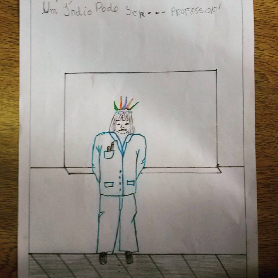 Na falta de colegas próximos que compartilhem experiências semelhantes comigo (outros indígenas professores em escola “de branco”), tenho precisado praticar a imaginação dentro e fora de sala de aula. Sou professora de artes, e arte poética e linguagem, ao meu ver, permite abordar qualquer assunto e qualquer área, sinto que com a arte acontece algo parecido em relação ao paradigma de conhecimento: arte muitas vezes não é considerada ciência simplesmente por usar outras linguagens, e ser assim, meio “diferente”, meio “E.T.”, por isso ninguém dá a mínima para artes, nem para professor de artes, e isso é ótimo, porque como arte “não parece sério”, as pessoas acreditam logo que estão brincando e relaxam para poder abrir suas cabeças para coisas novas, até para notar que “índio” não é “E.T”.