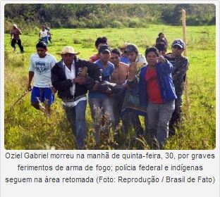 No começo do ano, foram os Guarani Kaiowá que tiveram de lutar pela sobrevivência e permanência nas terras de Pyelito Kue (MS). Na última quinta-feira (30), o índio Oziel Gabriel foi assassinado por policiais federais em uma ação de reintegração de posse. Houveram protestos e novas ocupações por parte da tribo Terena, que relatou terrorismo em conflito por terra no Mato Grosso do Sul.