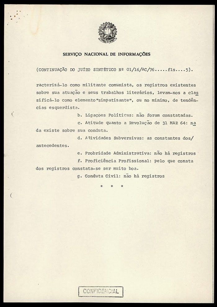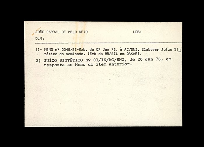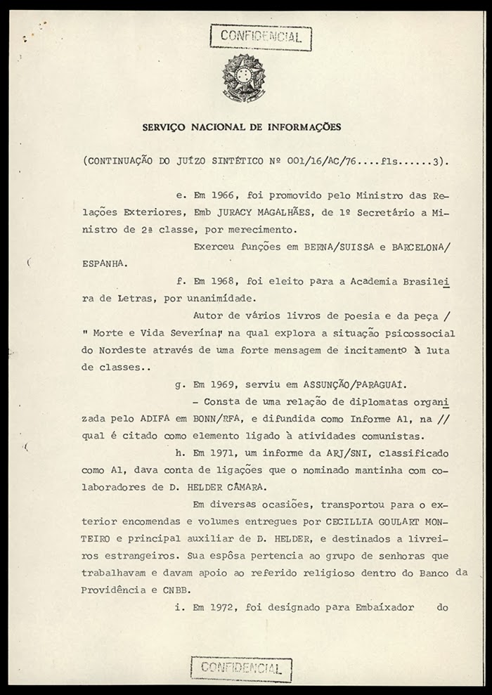 Em 1964 o diplomata João Cabral de Melo Neto estivera numa lista de onze diplomatas que deveriam ser cassados. Foi poupado. Doze anos depois o chanceler Azeredo da Silveira incluiu-o na lista de promoções para ministro de primeira classe, e o presidente Ernesto Geisel pediu ao general João Baptista Figueiredo, então chefe do Serviço Nacional de Informações (SNI), que lhe enviasse a ficha do poeta, lembrando que ele havia sido demitido de suas funções no Itamaraty “por questões de segurança” e que retornara “por via judicial”. Cabral havia sido posto em disponibilidade nos anos 1950, sob a acusação de pertencer ao Partido Comunista. Reintegrado por decisão do Supremo Tribunal Federal, foi parar na lista de cassações em 1964. O SNI, em um Juízo Sintético de 20 de janeiro de 1976, via assim o poeta: “Autor de vários livros de poesia e da peça Morte e vida severina, na qual explora a situação psicossocial do Nordeste através de uma forte mensagem de incitamento à luta de classes. (...) Embora não existam elementos que possam caracterizá-lo como militante comunista, os registros existentes sobre sua atuação e seus trabalhos literários levam-nos a classificá-lo como elemento ‘simpatizante’, ou no mínimo, de tendência esquerdista”.