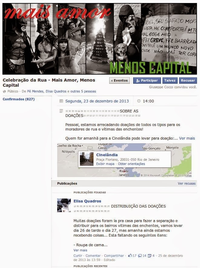 14 de Fevereiro de 2014, 7:28 - sem comentários aindaO jornal O Globo (clique aqui) e a revista Veja (clique aqui) se uniram para transformar um financiamento coletivo de um evento público que arrecadou mantimentos para moradores de rua e vítimas de enchentes em uma suposta festa de financiamento de ações criminosas.Uma ação beneficente virou, na interpretação da grande mídia, um provável crime.