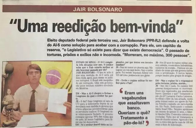 Em tempos de saudosismo, os que defenderam o golpe e depois o AI5 tornaram-se algozes do regime e depois vieram iguais "Madalenas arrependidas" chorar suas lágrimas em defesa da democracia. As searas que clamam a volta da AI5 poderão ter o mesmo destinos e podem terminar igual ao deputado marombeiro pedindo justiça e direitos humanos .