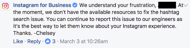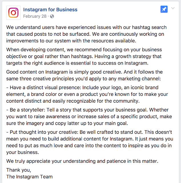 Na verdade, o Instagram respondeu publicamente a essas preocupações, mas de certa forma um usuário chamou isso de "irremediavelmente inepto". Em um post na página do Facebook, do Instagram For Business, a empresa admitiu que havia um problema, mas não ofereceu nenhuma solução. Em vez disso, basicamente disseram às pessoas para parar de confiar em hashtags.