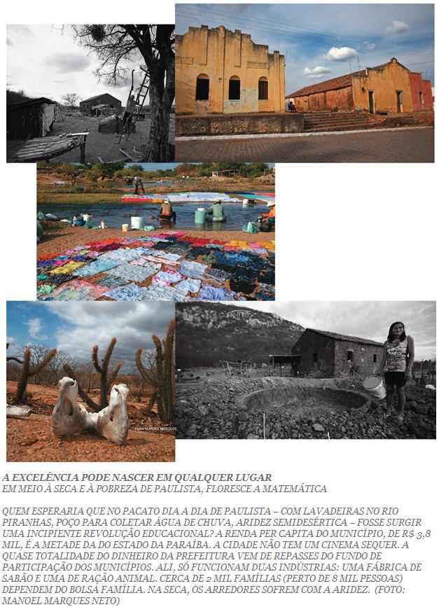 Na semana que antecedeu o Natal, eu e o fotógrafo Manoel Marques Neto enveredamos rumo ao alto sertão da Paraíba. Tínhamos como destino a pequena Paulista, uma cidade com 11.783 habitantes, a 397 quilômetros de João Pessoa, a capital do estado. Nossa missão era entender um fenômeno. Os estudantes do município paraibano, encravado no coração do semiárido nordestino, haviam se destacado em uma olimpíada de matemática, que mobilizou no ano passado 19,1 milhões de alunos da rede pública em todo o país. Os paulistenses conquistaram 22 prêmios. Foram cinco medalhas de ouro (um recorde para cidades desse porte), duas de prata, três de bronze e 12 menções honrosas. Tal resultado foi surpreendente. Superou, em termos proporcionais, o desempenho obtido pelos jovens entre 9 e 17 anos das principais cidades do Brasil.