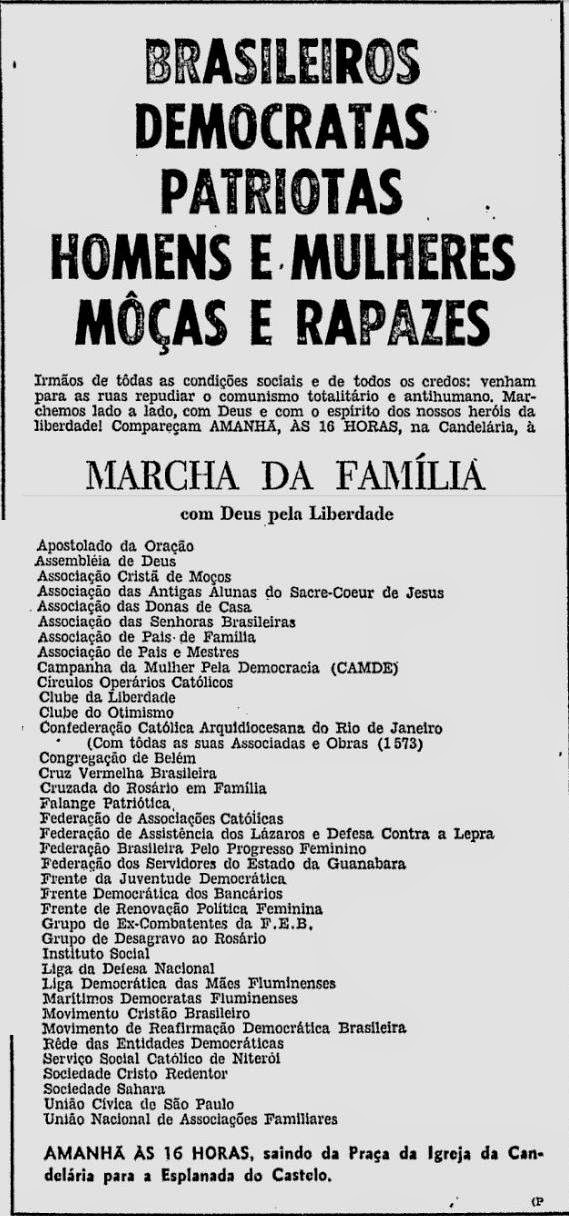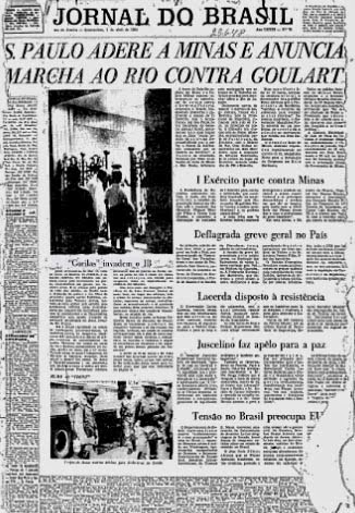 O jornal iludia-se como uma senhora de classe média desinformada: “Queremos as reformas de base votadas pelo Congresso. Queremos a intocabilidade das liberdades democráticas. Queremos a realização das eleições em 1965. A nação não admite nem golpe nem contragolpe”. No editorial “Fora!”, saiu do armário: “Só há uma coisa a dizer ao Sr. João Goulart: 'Saia!”' Veredicto: “João Goulart iniciou a sedição no país”. E mais: “A nação não mais suporta a permanência do Sr. João Goulart à frente do Governo. Chegou ao limite final a capacidade de tolerá-lo por mais tempo. Não resta outra saída ao Sr. João Goulart senão a de entregar o Governo ao seu legítimo sucessor”. Como poderia de um golpe vir um “legítimo sucessor”? Mistérios do jornalismo: “Hoje, como ontem, queremos preservar a Constituição. O Sr. João Goulart deve entregar o Governo ao seu sucessor porque não pode mais governar o País”.