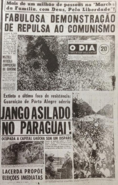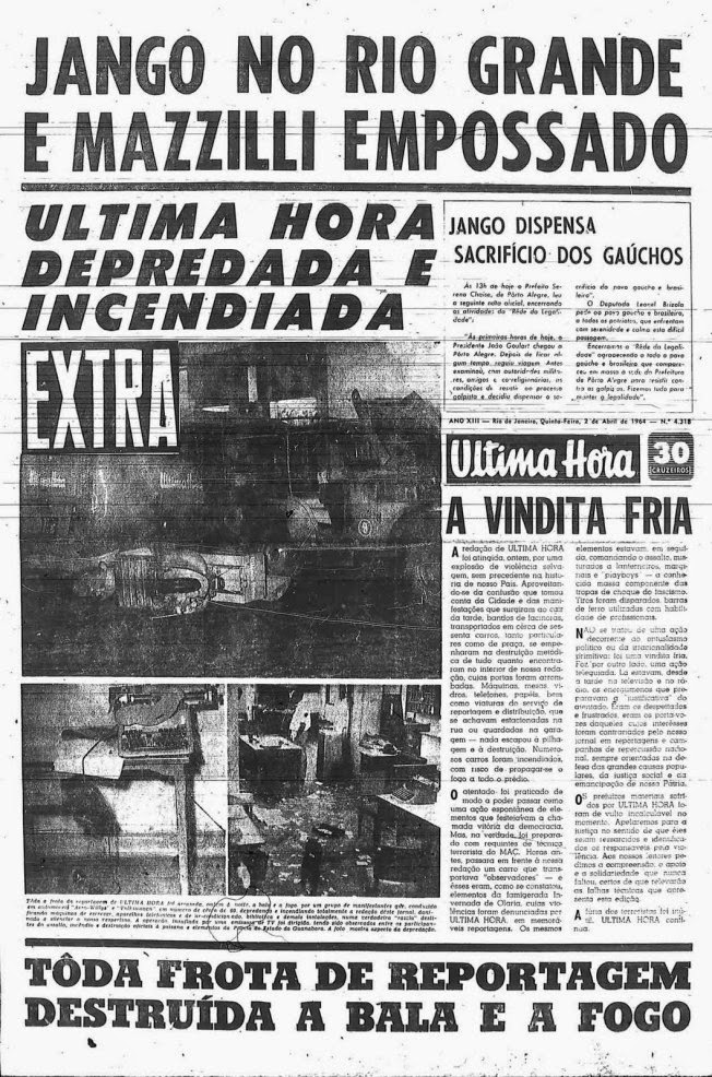 A “Mensagem ao Congresso”, enviada por Jango em 15 de março, detonou o horror na imprensa golpista. O confronto com os marinheiros reunidos no Sindicato dos Metalúrgicos, no Rio de Janeiro, em 25 de março, deu nova e poderosa munição para o golpismo midiático: as Forças Armadas estariam minadas pela indisciplina. Os marinheiros da base da hierarquia tinham reivindicações subversivas, entre elas... o direito ao casamento. A mídia considerava tudo isso muito radical. Em 30 de março, Jango compareceu ao encontro dos sargentos no Automóvel Clube do Rio. Foi a senha para o autodenominado “vaca fardada”, o general Olympio Mourão Filho, dar o seu coice mortal, marchando com suas tropas de Juiz de Fora para o Rio. A mídia exultou.