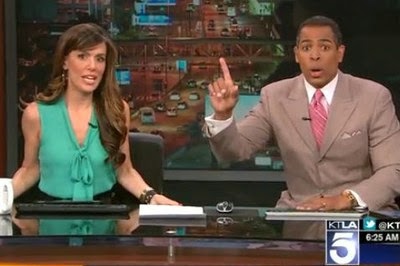 | Âncoras da emissora KTLA estavam transmitindo jornal ao vivo quando ocorreu o terremoto. Eles se esconderam embaixo da bancada. No Los Angeles Times, um algoritmo escreveu a notícia |