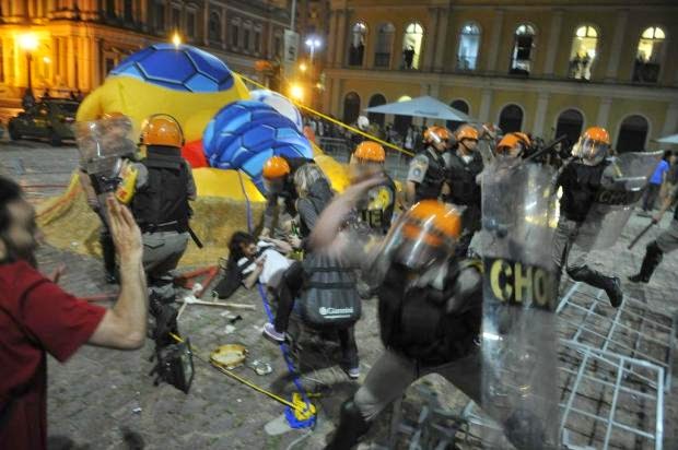 No Brasil, temos desocupações violentas com a utilização de ferramentas do Estado. Em Porto Alegre chegou-se ao cúmulo de utilizar a Brigada Militar (PM gaúcha) para proteger de manifestantes, um boneco inflável do mascote da Copa vestindo uma camisa com a marca do refrigerante patrocinador do torneio. Detalhe: o tatu inflável estava colocado em espaço público. O privado sobre o público. Os aparatos do Estado investem contra pessoas que não tem outro lugar para morar (a não ser a ocupação). Ocupações que eram defendidas em outros tempos por certas bandeiras vermelhas de outrora.