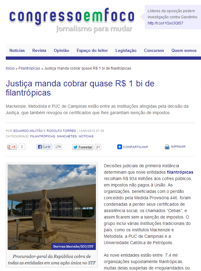 Este assunto pessoal só voltou a povoar minha mente por conta de uma notícia que li no Congresso em Foco: Justiça manda cobrar quase R$ 1 bi de filantrópicas. A matéria pode ser lida ao clicar no link. O fato é que a Justiça mandou cobrar de várias instituições filantrópicas cerca de R$ 1 Bilhão. Dentre elas, a Pontifícia Universidade Católica de Campinas, a Puccamp, que deve cerca de R$ 240 milhões em impostos não pagos para a União. Além disso, estas entidades são suspeitas de irregularidades ou mesmo fraudes detectadas pela Polícia Federal.