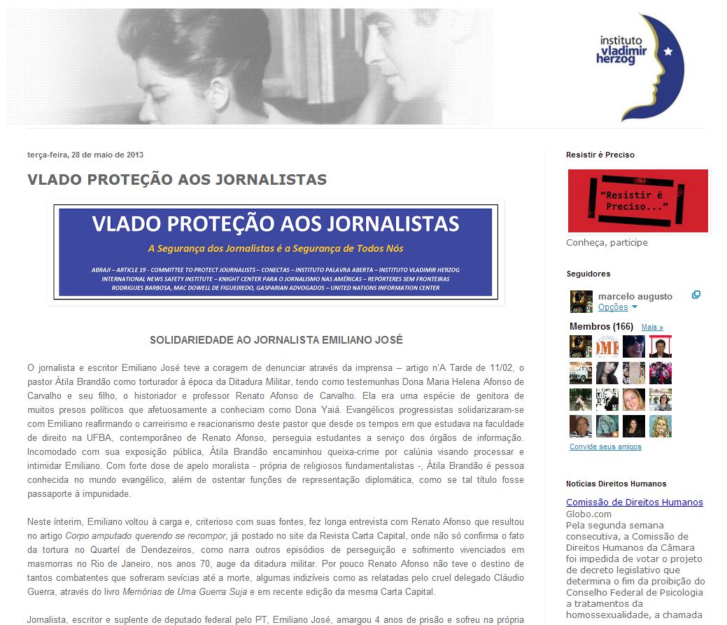 June 11, 2013 21:00 - no comments yetMuito além da segurança pessoal dos jornalistas e de todos os profissionais que trabalham em veículos de comunicação, essa luta visa fortalecer a instituição da liberdade de expressão e assegurar o direito de todos os cidadãos ao acesso a informações que lhes permitam formar seus próprios juízos individuais a respeito dos assuntos de interesse público da vida nacional.