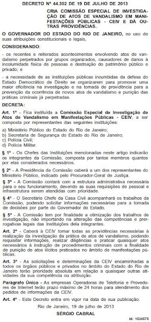 Para quem, muito incautamente, espera que o governador mande investigar tais condutas, Sérgio Cabral Filho já deu a resposta: o decreto 44.302 de 19 de julho de 2013 criou (isto é, autorizou a criação) a "Comissão Especial de Investigação de Atos de Vandalismo em Manifestações Públicas - CEIV".