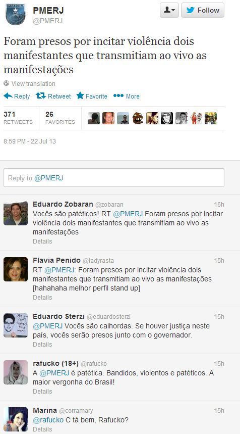 - Ameaça à Ordem dos Advogados (https://twitter.com/PMERJ/status/359462463785283586) ;