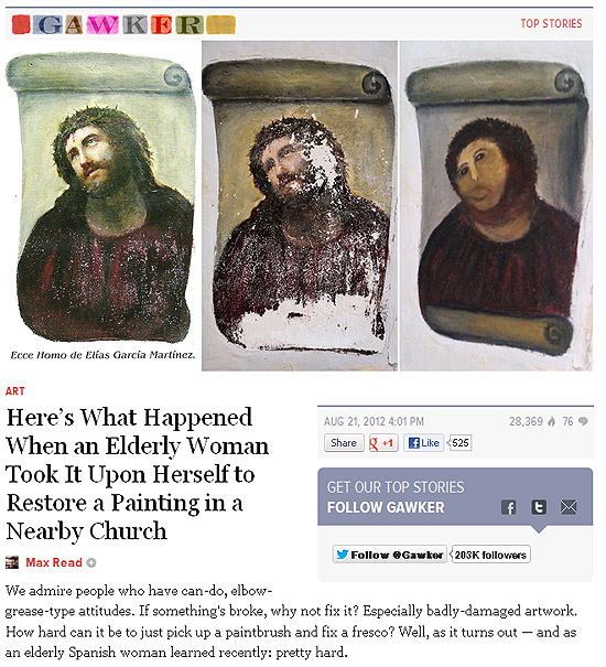 Quando foram atrás da pintura depois de receber a doação, viram que ela havia sido modificada. Uma mulher vizinha da igreja, localizada na cidade de Borja, ao ver que a obra estava danificada, resolveu restaurá-la “sem pedir permissão”, mas “com boas intenções”. Ela confessou o fato às autoridades.