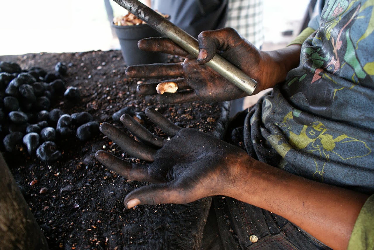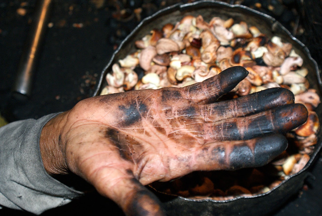 O óleo presente na casca da castanha de caju é ácido. Mais conhecido como LCC (Líquido da Castanha de Caju), esse líquido melado que gruda na pele e é difícil de tirar tem em sua composição ácido anacárdico, que corrói a pele, provoca irritações e queimaduras químicas. No vilarejo Amarelão, na zona rural de João Câmara, as castanhas são torradas – além de corroer a pele, o óleo é inflamável – e quebradas em um sistema de produção que envolve famílias inteiras, incluindo as crianças.