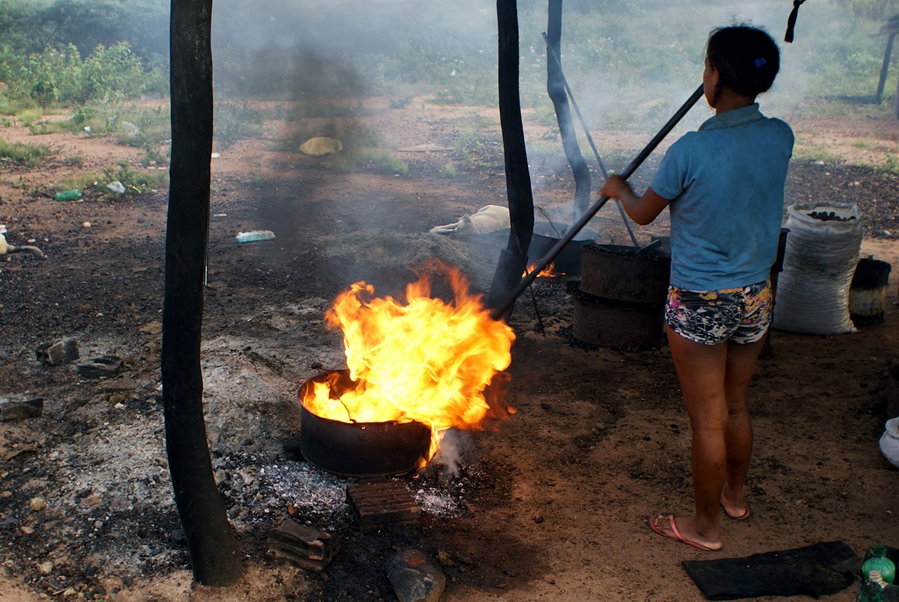 Um menino e uma adolescente se revezando ao redor da mesa. A garota é quem cuida do fogo, alimenta a lata improvisada com cascas de castanha e controla as labaredas espirrando água com uma garrafinha. A fumaça sobe e cobre seu rosto. Um cachorro dorme perto do fogo. Eles estão nessa atividade desde a madrugada, começaram às 3 horas. É preciso começar cedo, no sol do sertão nordestino, não dá para continuar com o calor de meio-dia.