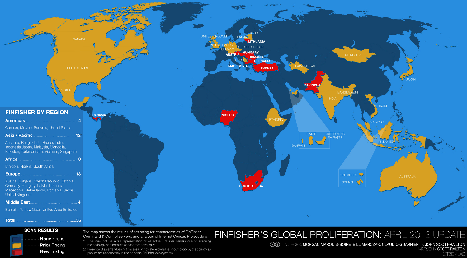 Seu principal produto, o software-espião FinFisher, infecta computadores para capturar informações, enviadas a uma central interceptadora. Pesquisadores da Universidade de Toronto descobriram servidores de monitoramento do FinFisher em 36 países – incluindo Turquia, Paquistão, Panamá, Etiópia, Malásia, Qatar e Vietnã. Também encontraram o spyware “disfarçado” do navegador Mozilla Firefox, uma isca para levar “alvos” a fazer o download em seus computadores. ( Veja o mapa)