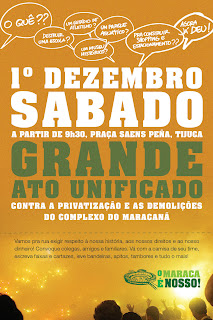 Mas o Maraca não é shopping e a gente não é bobo! Vamos pra rua mostrar o Maraca que queremos: um parque PÚBLICO que sirva ao esporte, à saúde, ao lazer, à cultura e à educação da população, e não a interesses de grupos empresariais.
