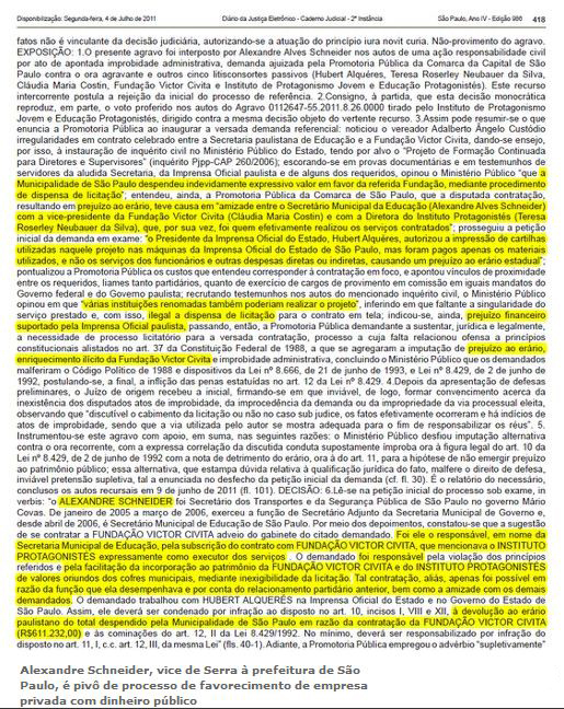 Luglio 2, 2012 21:00 - no comments yetEscolhido no último fim de semana para disputar a prefeitura de São Paulo como vice de José Serra (PSDB), Alexandre Schneider (PSD) tem contra si um processo em que é acusado por desvio de dinheiro dos cofres públicos da prefeitura e do estado de São Paulo para favorecer a Fundação Victor Civita – ONG ligada ao grupo Abril, dono da revista Veja.