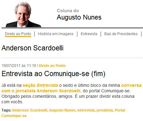 Se Anderson ainda faz jornalismo ou se ultimamente mantém seu contrato empregatício com o Portal Comunique-se apenas para manter sua opinião publicada pelo Portal, sinceramente não sei. O texto de Anderson traz algum fato jornalístico? Nenhum, a não ser pelo fato de Policarpo realmente se chamar Policarpo, pela Record realmente se chamar Record e assim por diante com os demais citados. Relevância jornalística? Não vi nenhuma, mas gostaria de me colocar disponível ao Portal Comunique-se, pois gostaria muito que me contratassem para publicar no Portal as minhas opiniões. Ainda que elas não expressem necessariamente a opinião da empresa (e isto é certo), e para fazer o equilíbrio argumentativo com Anderson Scardoelli, será um prazer trabalhar num Portal de Comunicação que propicia tanta liberdade e autonomia aos seus colaboradores (funcionários).