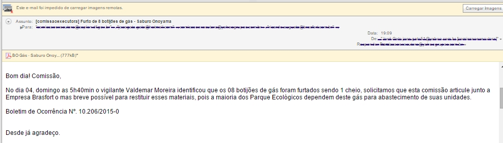 O furto de 8 botijões de gás do Parque Saburo Onoyama ocorreu no dia 4 do mês passado, entre as 00:20h e 05:40h, quando um dos vigilantes que trabalhavam no local constatou o furto. Desde então os funcionários estão privados de preparar ou aquecer alimentos.