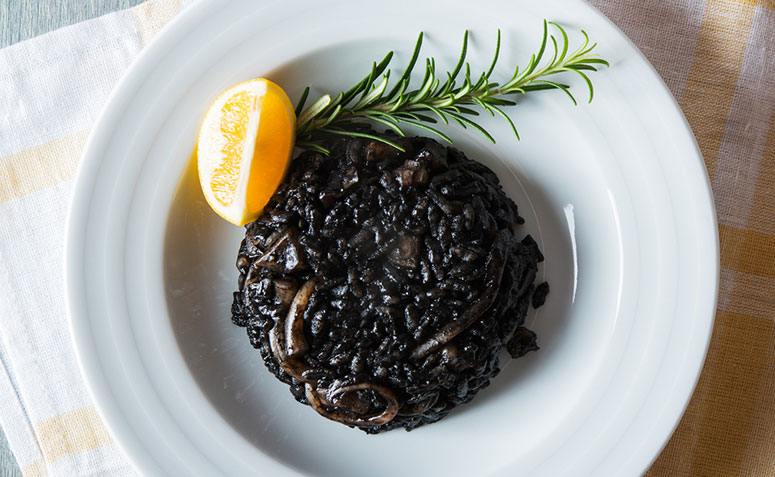 11. Arroz Negro Al Mare: o arroz selvagem é perfeito para ser consumido com frutos do mar. Nesta receita, ele é preparado com muitos temperos e servido com mexilhões, camarões e lula cortada em rodelas.