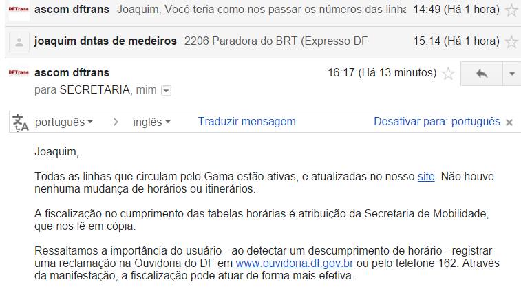 Sou jornalista e estou escrevendo uma matéria sobre a desativação da linha que contemplava as quadras 13, 15 e 17 do setor Sul do Gama. Para que eu possa divulgar os fatos com inteiro teor de verdade e com isenção, solicito que me informem os motivos que levaram o DFTrans a desativar a linha". Alguns minutos após ter enviado a mensagem o funcionário do GDF, da Assessoria de Comunicação, encaminhou-me um e-mail questionado: "Joaquim, Você teria como nos passar os números das linhas?"