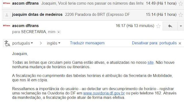 Sou jornalista e estou escrevendo uma matéria sobre a desativação da linha que contemplava as quadras 13, 15 e 17 do setor Sul do Gama. Para que eu possa divulgar os fatos com inteiro teor de verdade e com isenção, solicito que me informem os motivos que levaram o DFTrans a desativar a linha". Alguns minutos após ter enviado a mensagem o funcionário do GDF, da Assessoria de Comunicação, encaminhou-me um e-mail questionado: "Joaquim, Você teria como nos passar os números das linhas?"