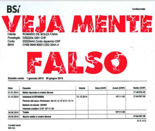 A revista publicou a foto de um recibo onde constava que o senador possuía mais de 2 milhões de Euros na suposta conta do banco BSI. Diante da matéria difamatória, Romário foi à Suíça para tirar o caso a limpo, onde obteve a confirmação de que o documento era falso.