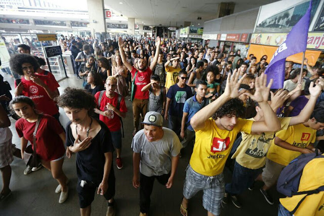 Até a última atualização desta reportagem, cerca de 70 pessoas se aglomeravam no terminal. Elas gritavam palavras de ordem, como “Mãos ao alto! Cinco conto é um assalto!”.