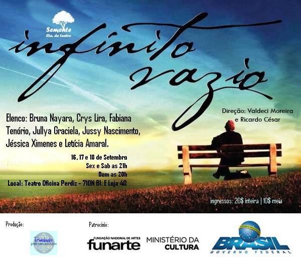 Em um processo provocativo e de colaboração a Semente Cia de teatro, que há oito anos vem desenvolvendo na cidade do Gama montagens e oficinas de teatro para formação de plateia, foi levantando cenas, ousando, gritando por criação. Quando achávamos que estávamos prontos, tudo teve que ser adiado e mais uma vez estávamos vazios. Entre o cheio e o vazio surgiram textos, frases e pensamentos de Caio Fernando Abreu, Sids Oliveira, Gero Camilo e da própria Cia., que fizeram com que o processo criativo transbordasse e se transformasse em um drama poético e desta forma o cheio e o vazio se completaram. Então nasceu o espetáculo poético musical “Infinito Vazio”. Vazio ainda, mas que pretende encher-se de emoções, junto com o público, que, sem medo, estando no seu vazio ou na sua plenitude, terá coragem de compartilhar conosco deste momento e quem sabe sacudir seus sentimentos, correndo o risco de esvaziar-se ou encher-se um pouco mais.