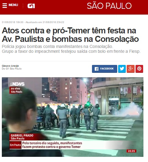 A mídia golpista – que, até então, não divulgara nada contra a manifestação –, vendo o tamanho do protesto contra Temer no dia do golpe que ele deu, tratou de, em aparente conluio com a PM, divulgar uma versão distorcida dos fatos.
